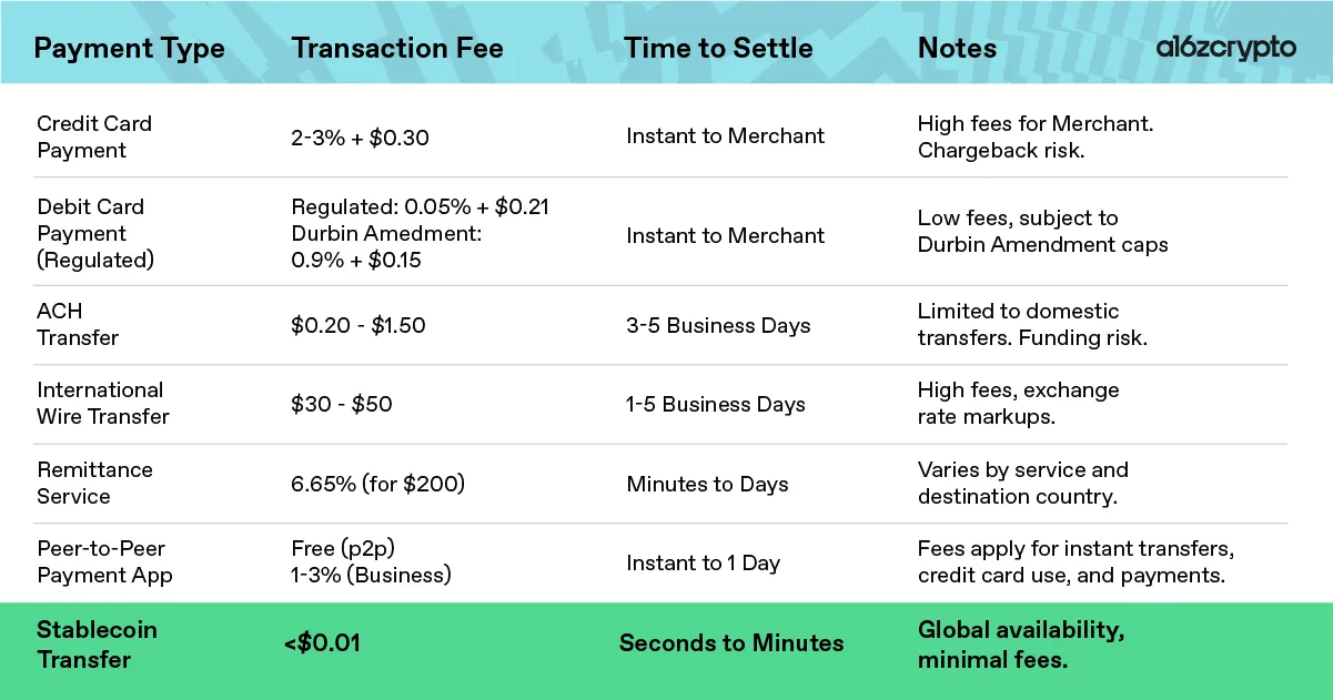 This disruption may take time — but it is likely to happen more quickly than many expect. Businesses like restaurants, retailers, enterprises, and payment processors would benefit most from the stablecoin platform, seeing radical improvements to their margins. That demand will drive adoption, and as stablecoin adoption grows, the other benefits of stablecoins — permissionless composability and improved programmability — will bring still more users, businesses, and products onchain. I share more on why and how below, beginning with some background on the payments industry.