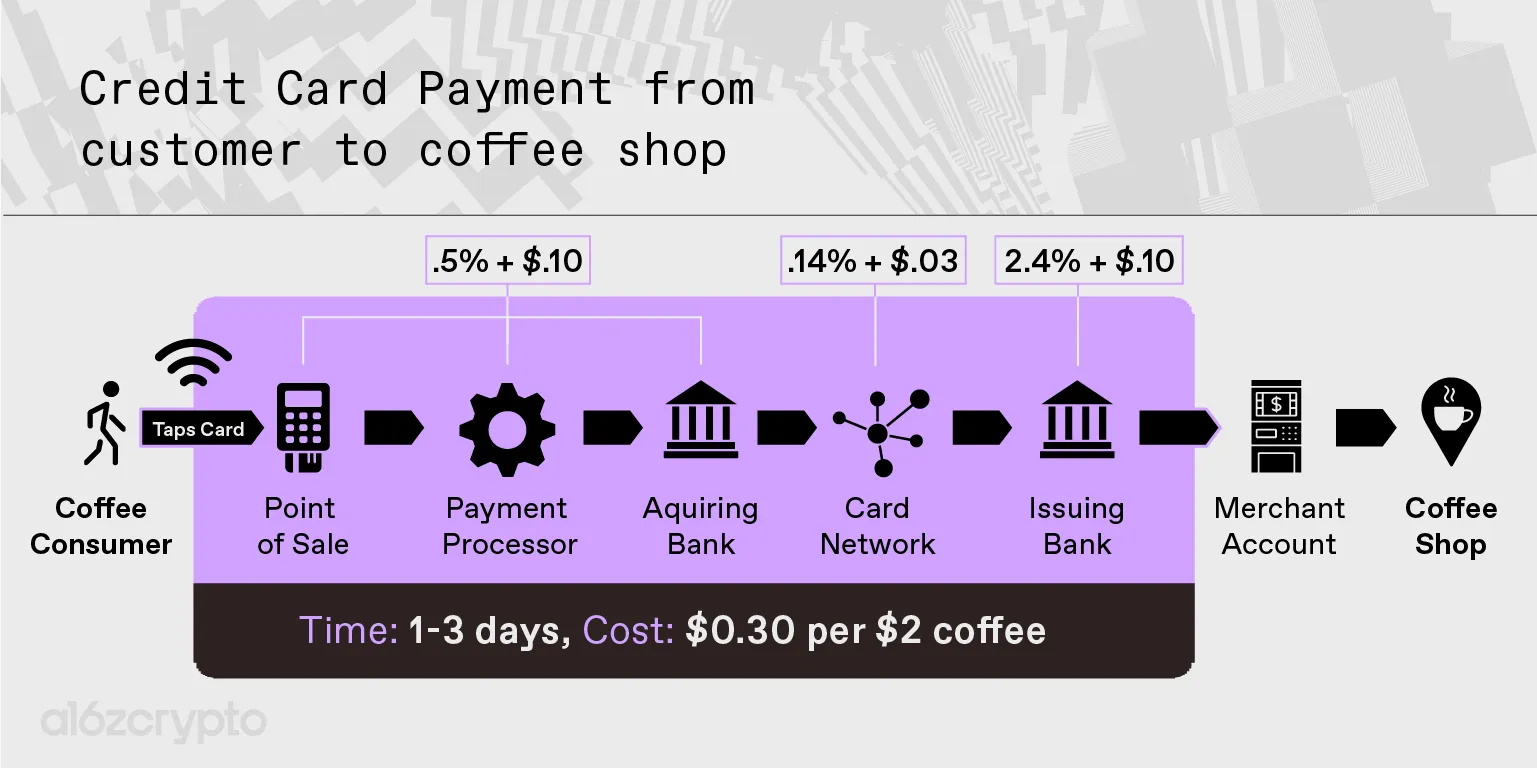 For every $2 a customer spends on coffee, only $1.70 to $1.80 goes to the coffee shop, with the nearly 15% remaining going to the card companies — merely for facilitating the transaction. But credit cards are only being used for convenience here: Neither the consumer, nor the shop, needs the additional features that justify the fee. The consumer doesn’t need fraud protection (they were just handed a coffee) or a loan (the coffee was $2). And coffee shops have limited compliance and banking integration needs (coffee shops often use comprehensive restaurant management software or nothing at all). So if there were a cheap, reliable alternative, expect these businesses to take advantage of it.