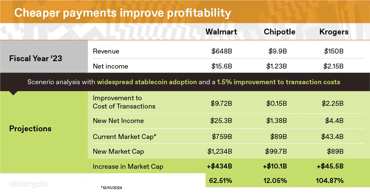 Greater stablecoin adoption would significantly improve profitability in many businesses — and not only for small businesses like coffee shops or restaurants. Let’s look at three public companies’ fiscal year 2024 financials to approximate the effect of reducing payment processing to 0.1%. (For convenience, this evaluation assumes that the businesses are paying a 1.6% blended payment processor cost and have minimal on/offramp costs. More on this below.)